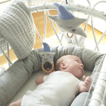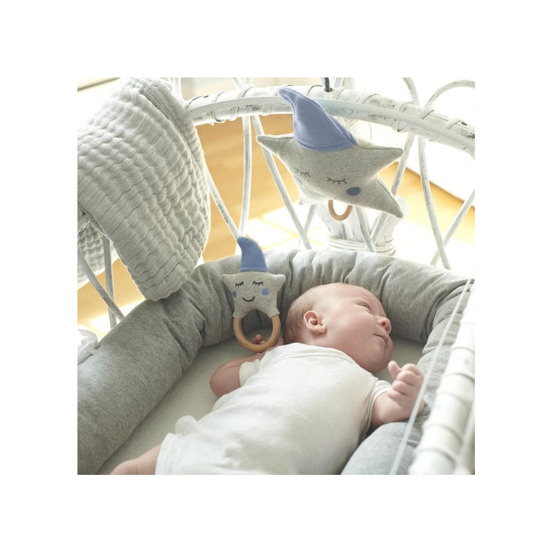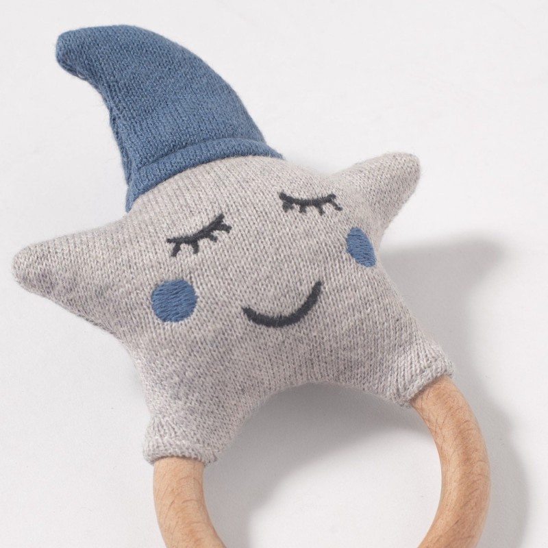Très original cet anneau de dentition bois et son hochet étoile de coton, à l'air endormie et vêtue de son petit bonnet de nuit bleu.