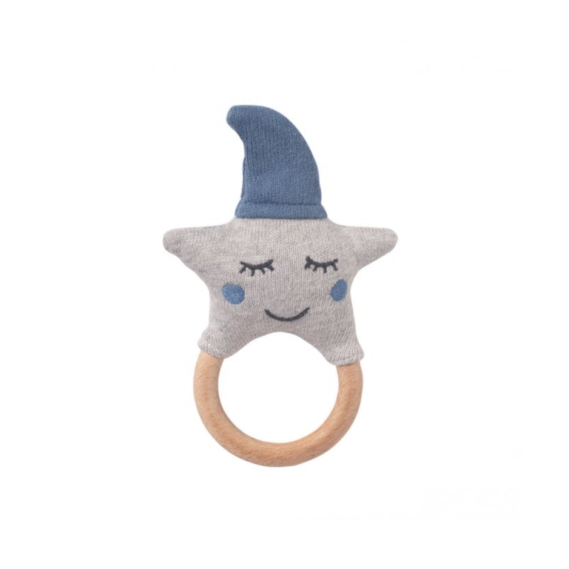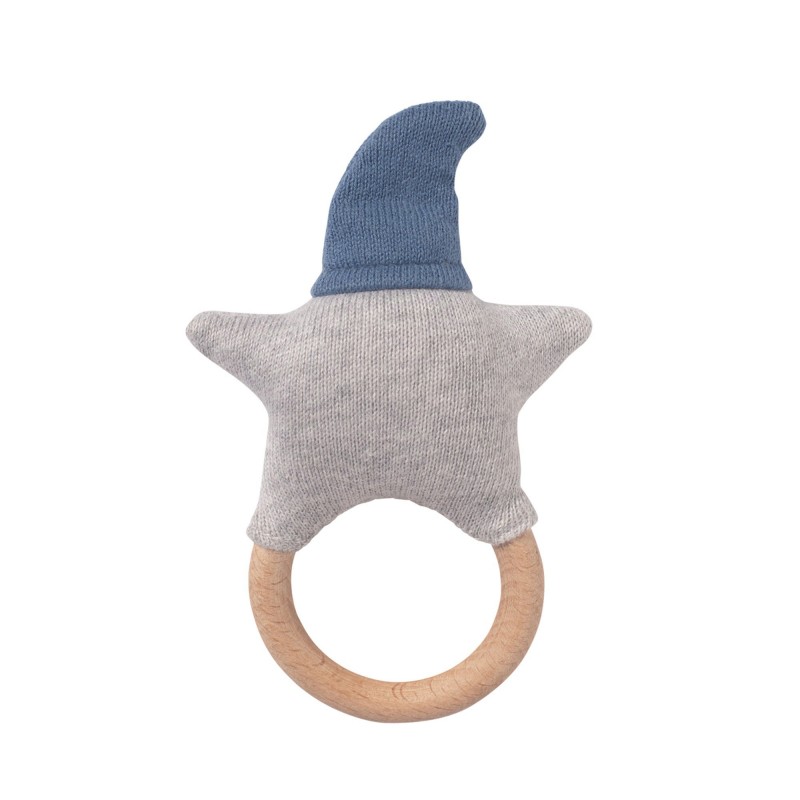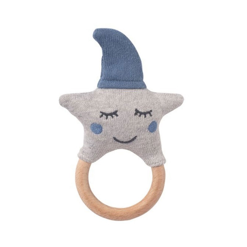 Anneau de dentition bois et coton avec hochet Etoile bleu - Nordic Coast Company