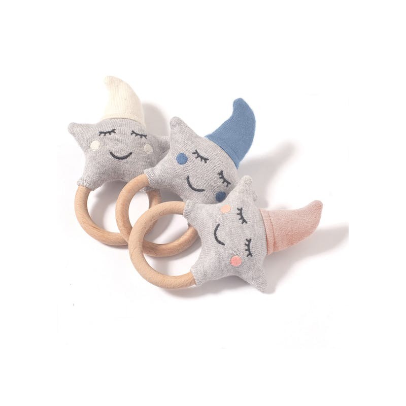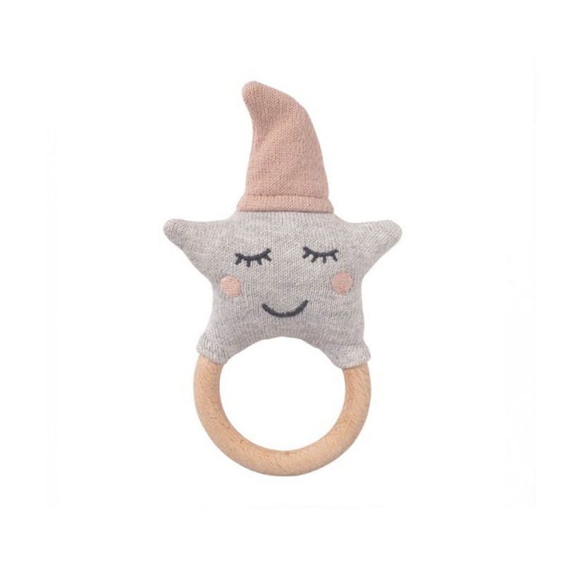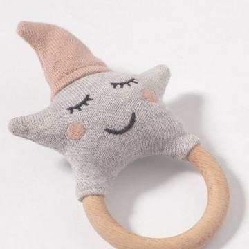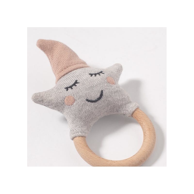 Très original cet anneau de dentition bois et son hochet étoile de coton, à l'air endormie et vêtue de son petit bonnet de nuit rose.