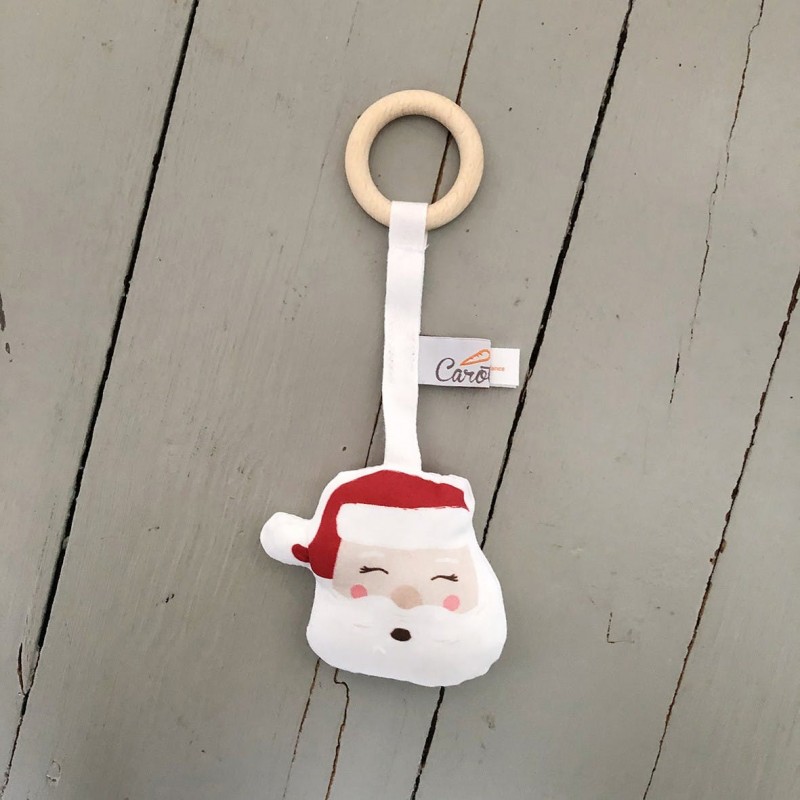 Un Père noël toujours aussi joyeux et rassurant en popeline de coton ocre rouge et blanc accroché à son anneau de dentition en bois.